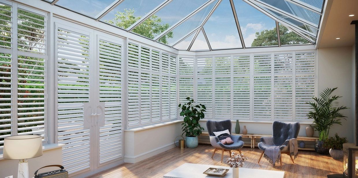 Our conservatory shutters can be fitted at angles, providing shading from the sun on both conservatory windows and sloping roof.